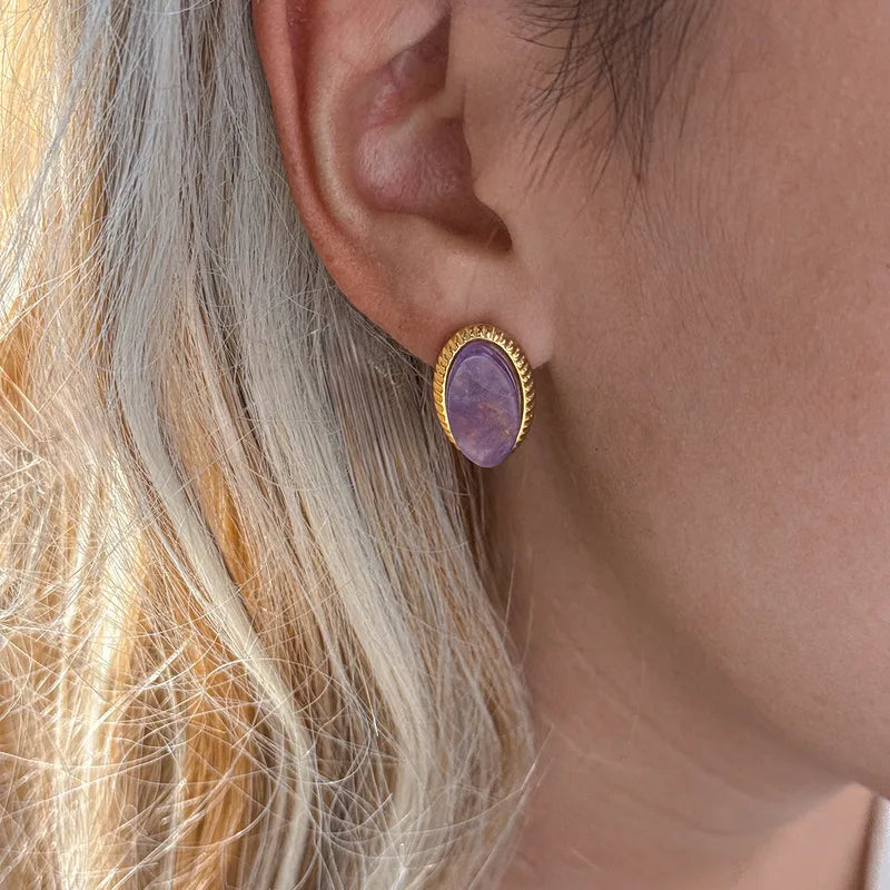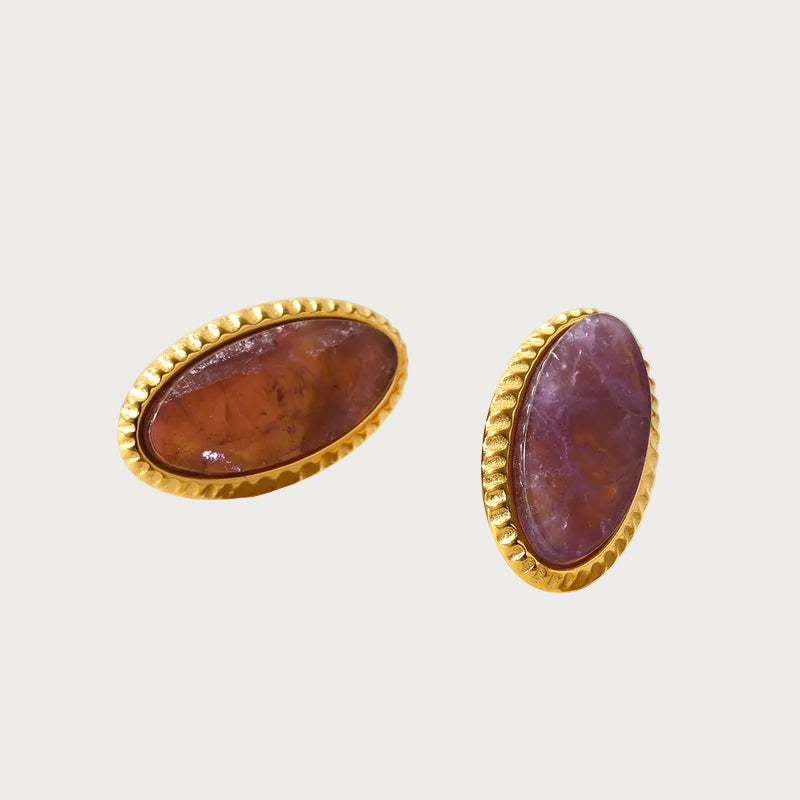 The Golden Aura Earrings are the perfect blend of elegance and uniqueness, a subtle pop of color with a luxurious look. The natural stone catches the light beautifully, making each earring unique. Surrounded by a refined gold rim, the earrings have a warm, chic look that's perfect for both day and night.