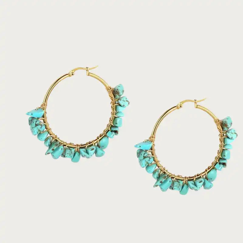 These turquoise earrings instantly bring a summery, fresh vibe to your look. The gold-tone hoops are finished with genuine turquoise natural stones, giving each earring a playful and unique character. The bright blue-green hues add just the right amount of color without being overpowering.