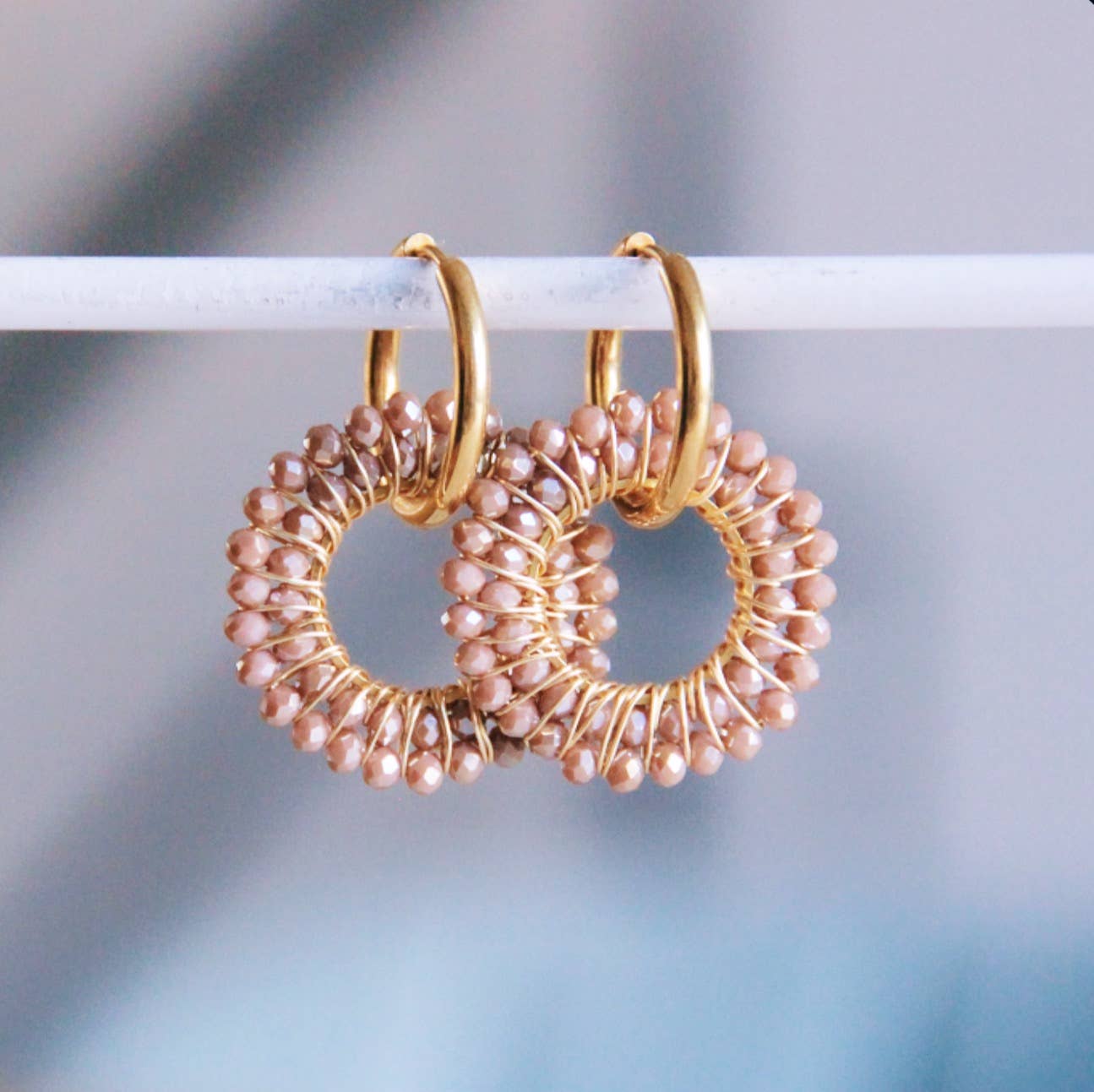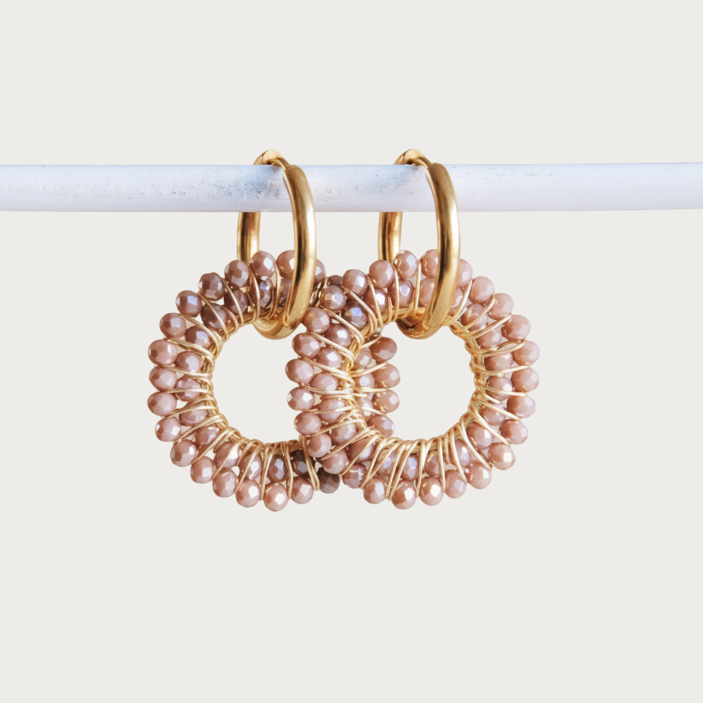 Bloom Circle heeft meteen die zachte, warme uitstraling. Deze oorbellen vallen op door de ronde hanger vol kleine glanzende kraaltjes. Het gouden ringetje houdt ’m licht en comfortabel, terwijl de koraalroze tint van de kraaltjes je look echt een lieve touch geeft.