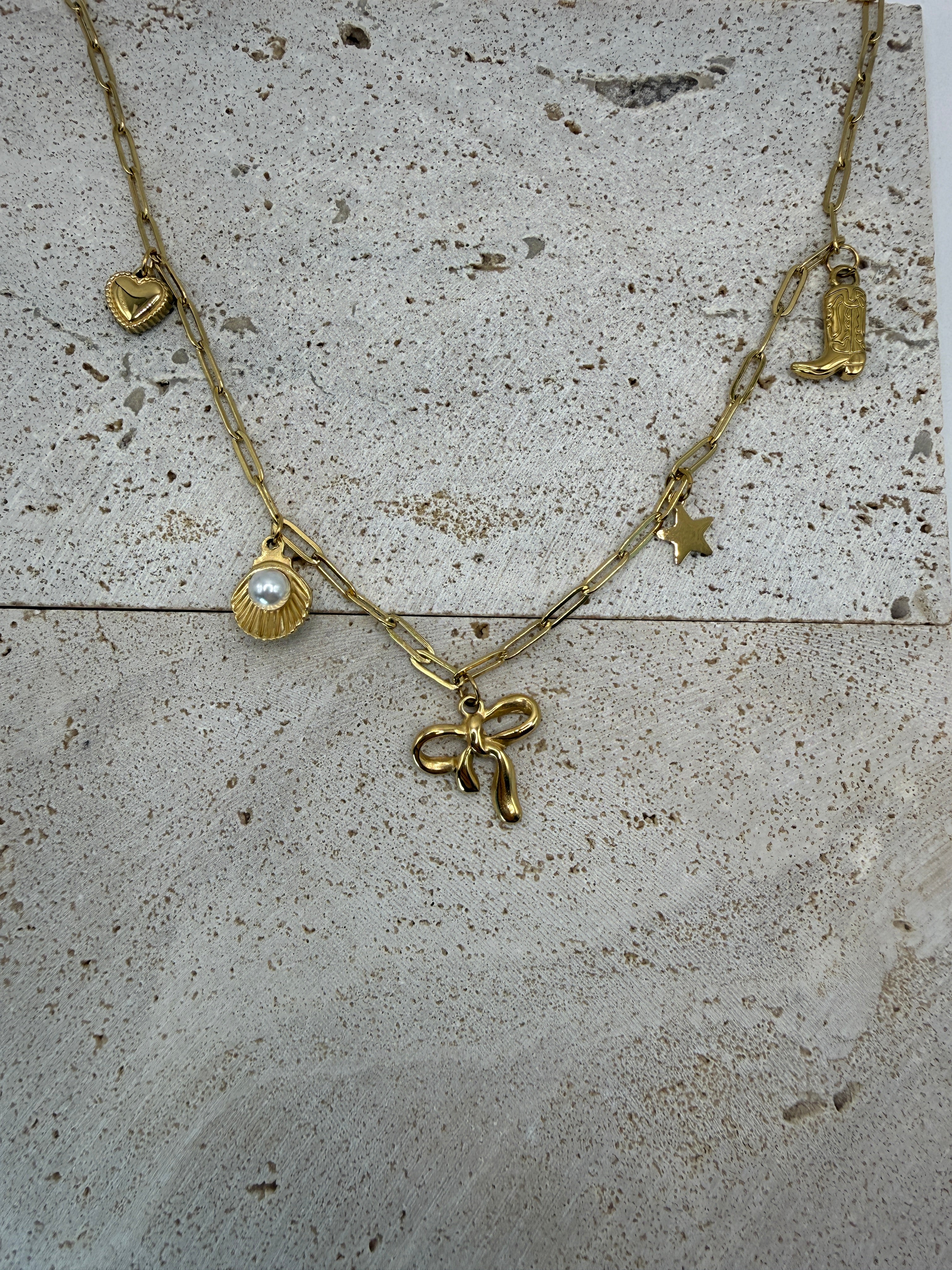 Voeg een speelse, zomerse touch toe aan je look met de Bow Beach ketting. Deze goudkleurige stainless steel ketting is rijkelijk versierd met charmante hangertjes: een strikje, schelp, ster, hartje en een beachy coin. De fijne paperclip chain geeft het geheel een classy uitstraling, terwijl de charms zorgen voor een effortless, fun vibe.