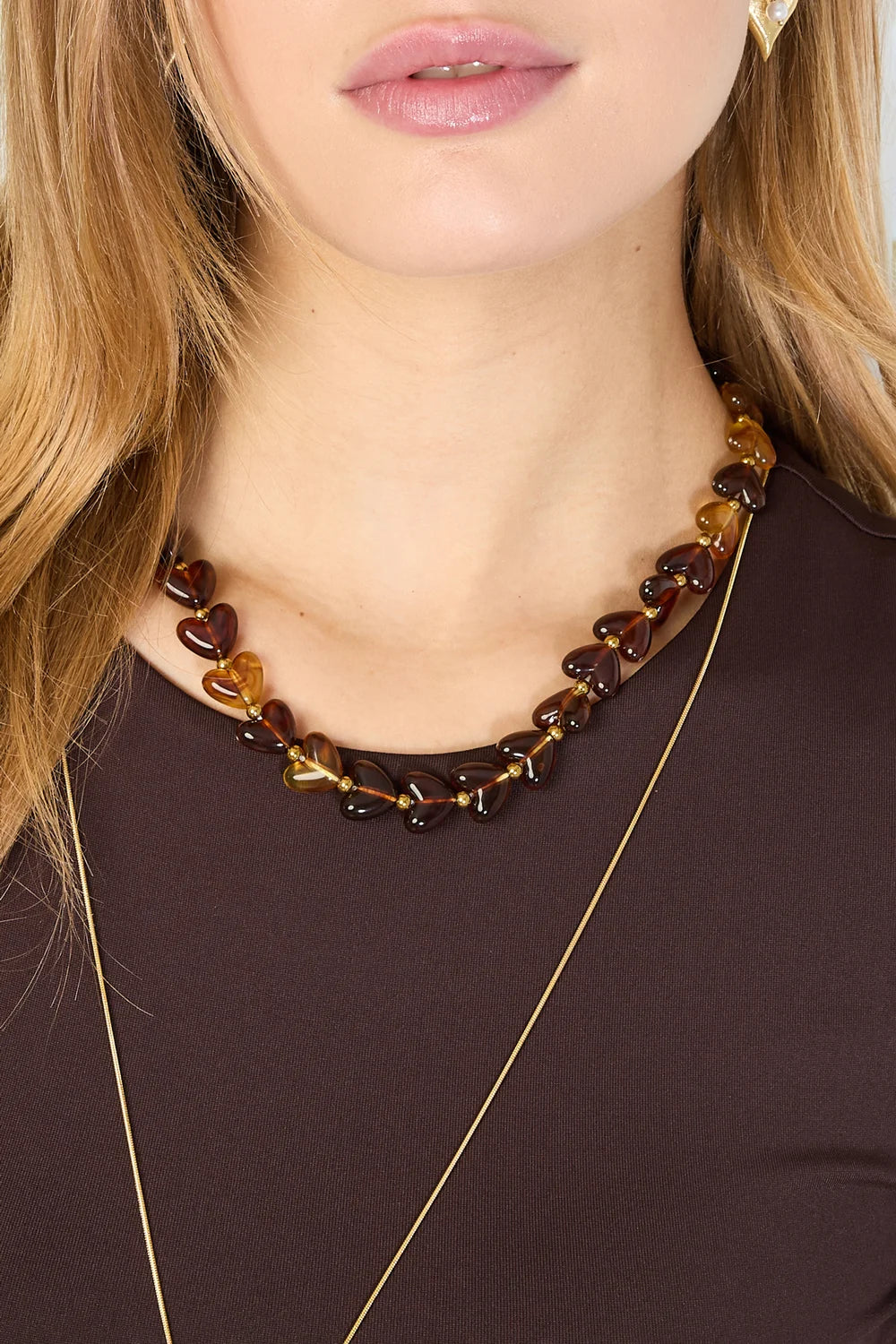 De Milena Hartjes Ketting in het groen is een vrolijke, speelse eyecatcher die elke look direct meer karakter geeft. De ketting bestaat uit glanzende hartvormige kralen in marmerachtig groen, subtiel afgewisseld met goudkleurige accenten. Dankzij de stainless steel sluiting blijft de ketting mooi van kleur, zelfs bij dagelijks dragen.