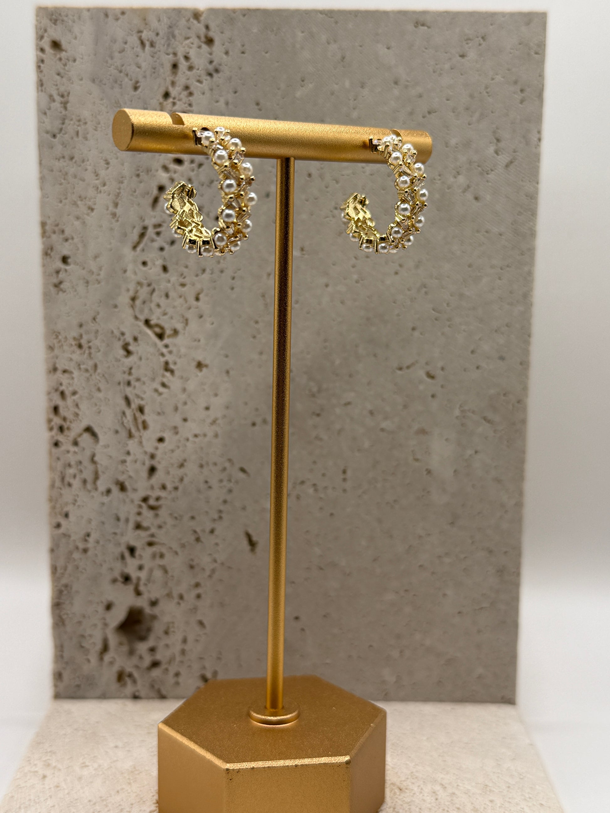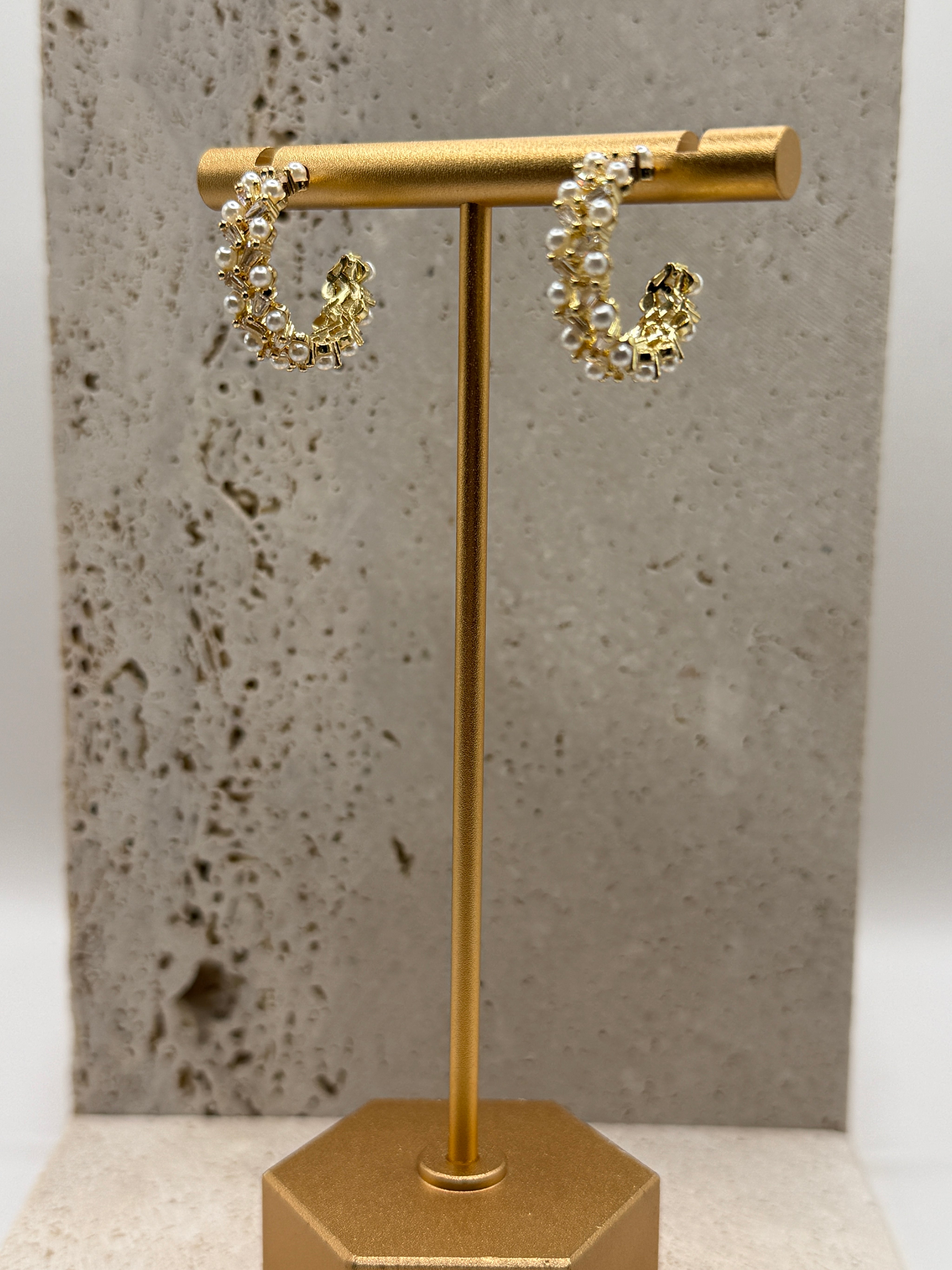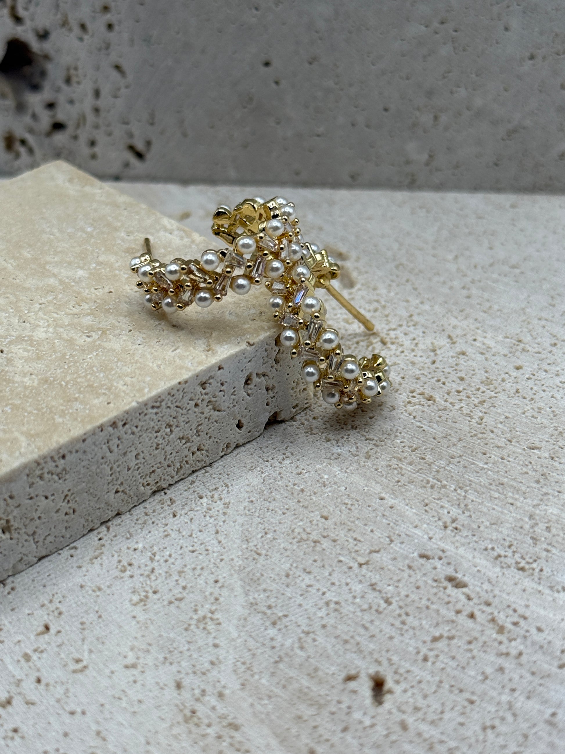 De Pearl Cluster oorbellen zijn het soort statement dat toch subtiel blijft. Het gedraaide C-shape design is rijkelijk versierd met kleine pareltjes en glanzende details, waardoor elke beweging het licht prachtig vangt. Door het speelse reliëf en de luxe uitstraling voelen ze chique aan zonder overdreven te worden, perfect voor zowel dagelijks gebruik als een avondje uit.
