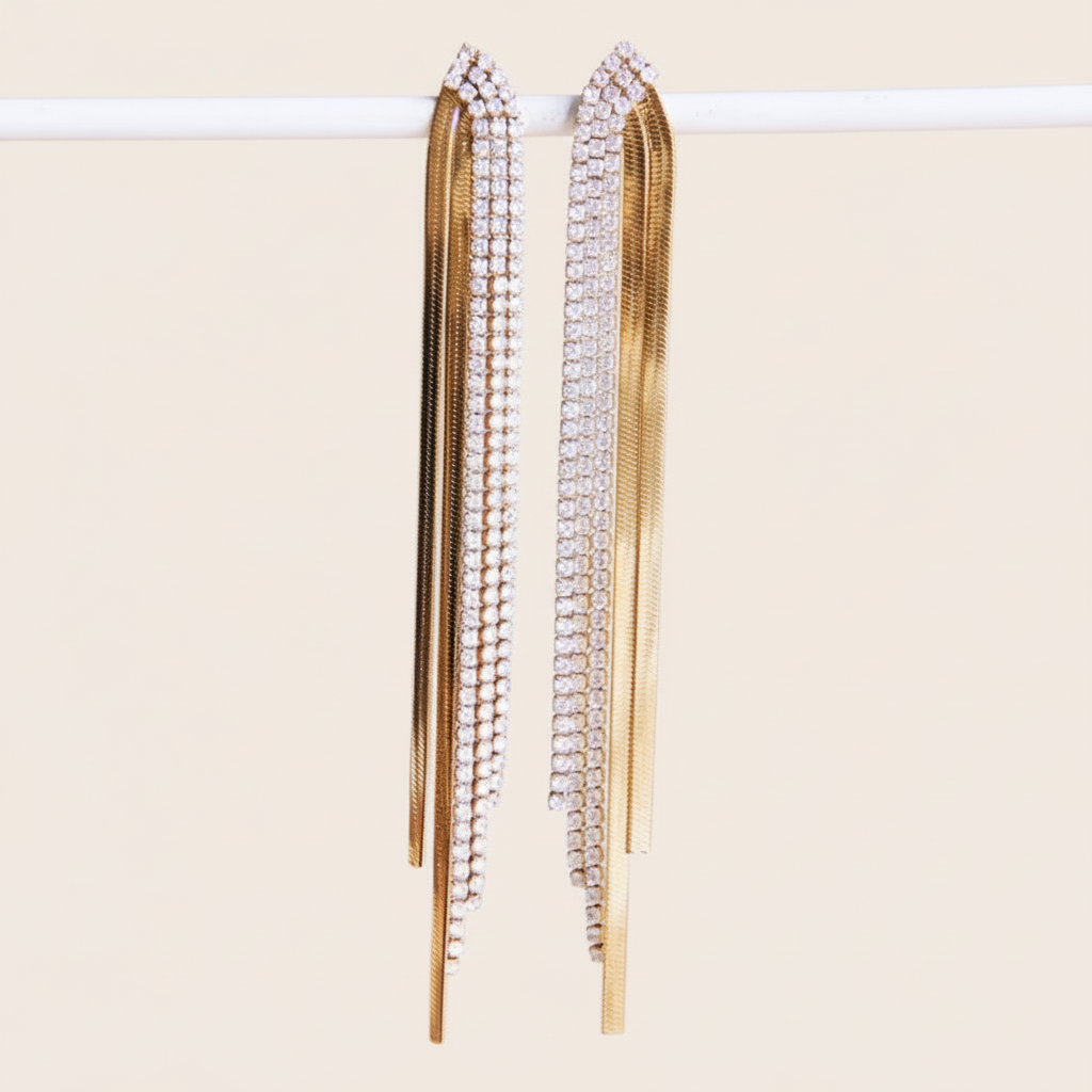 Golden Waterfall laat je look meteen shinen, deze oorbellen hebben dat prachtige waterval-effect waardoor ze bij elke beweging schitteren. De combinatie van gouden strengen en zirkonia zorgt voor een luxe, feestelijke uitstraling die elke outfit compleet maakt. Met hun lengte van 12 cm vallen ze mooi lang en elegant, terwijl ze verrassend licht dragen.